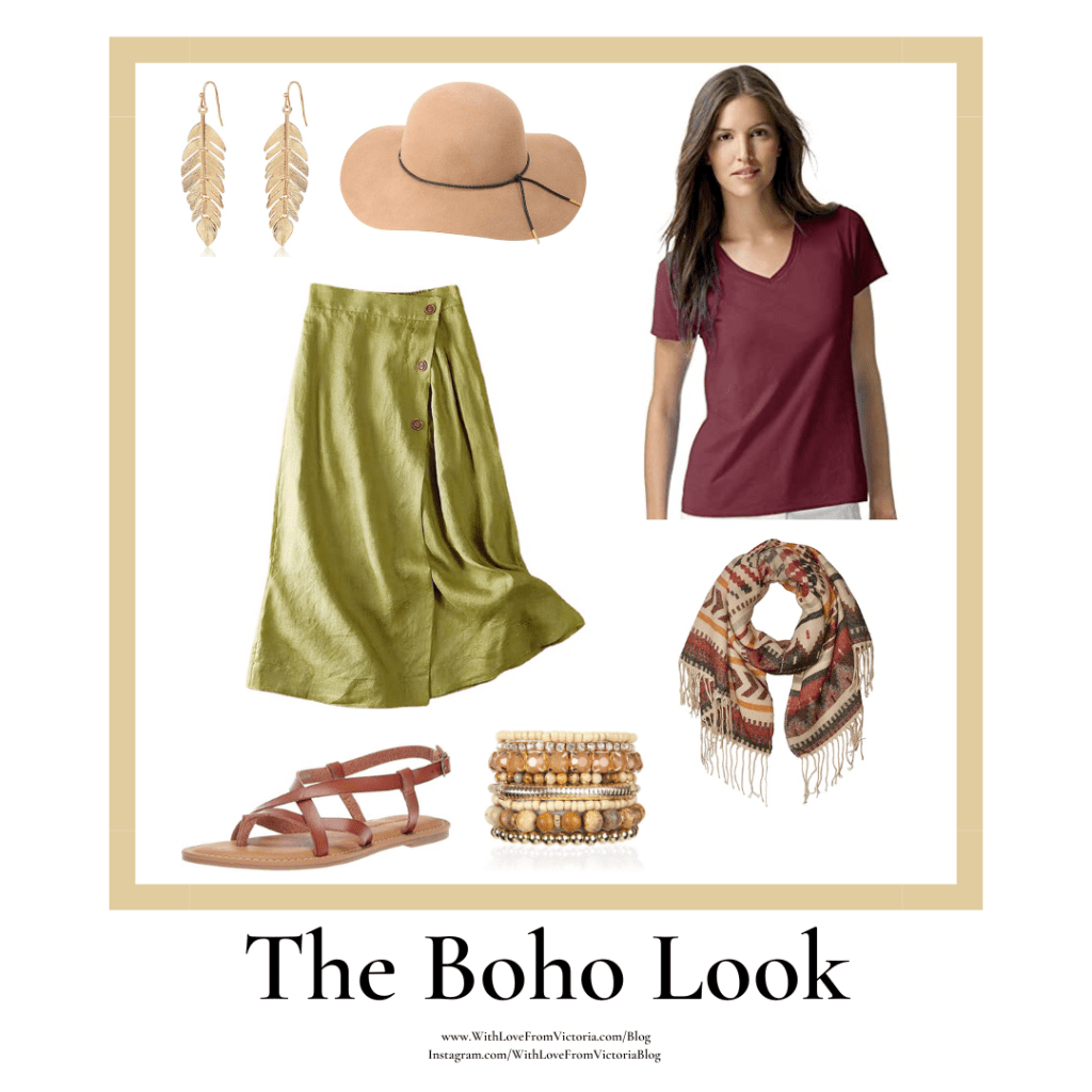 The Boho Look is all about the layers and natural fibers/textures! You can still look put together and stylish for date night while using basic staples in your wardrobe. Pair a linen wrap skirt with a plain Jane t-shirt, but elevate the style by adding a scarf. Stack bracelets with similar color tones, put on some dangle earrings, and a floppy hat for adventure!