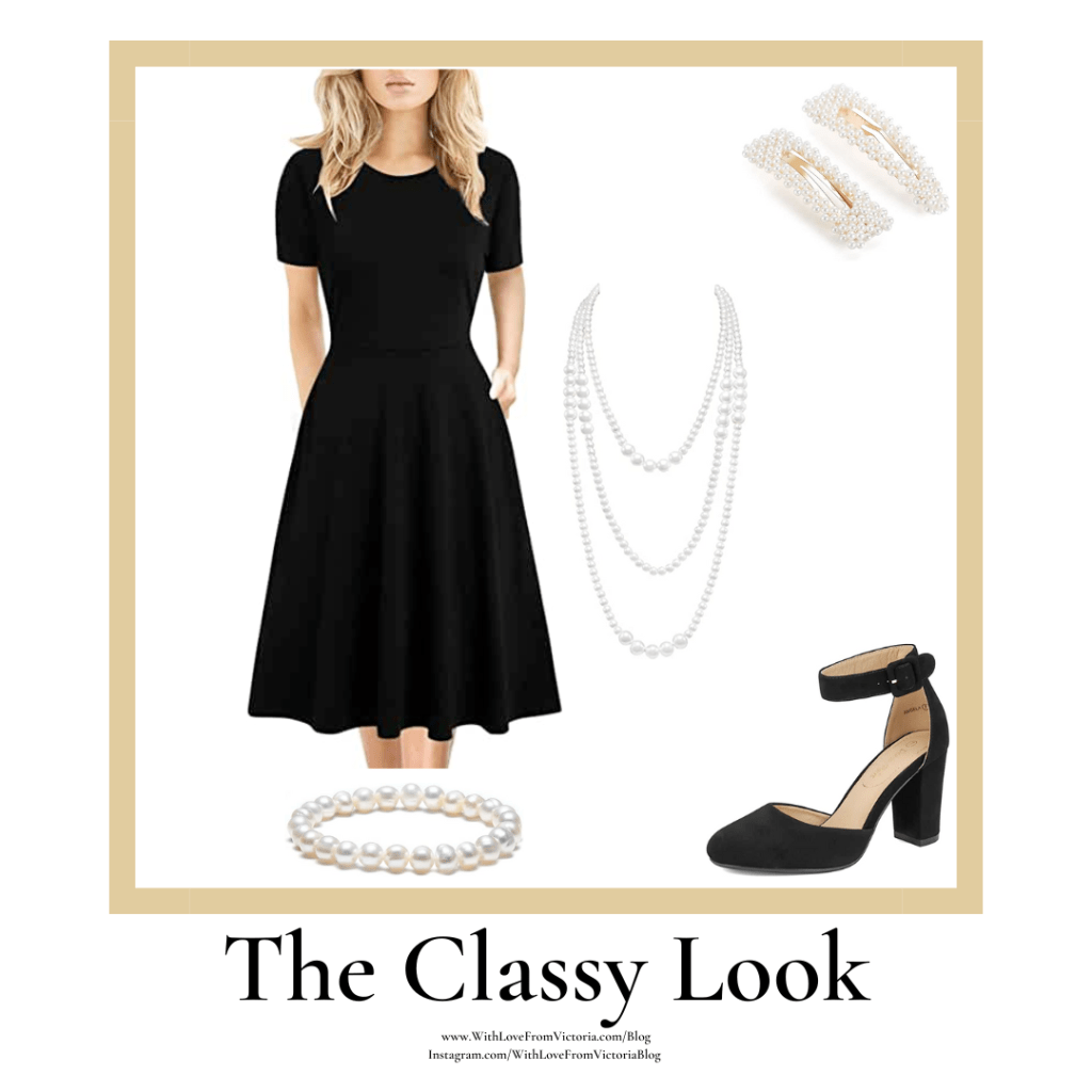 The Classy Look is simple and sleek. A solid colored dress paired with pearls is always timeless! Match your bracelet, necklace, and hair accessories for a cohesive look. And who doesn’t need an excuse to pull out some heels?!